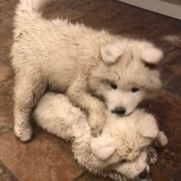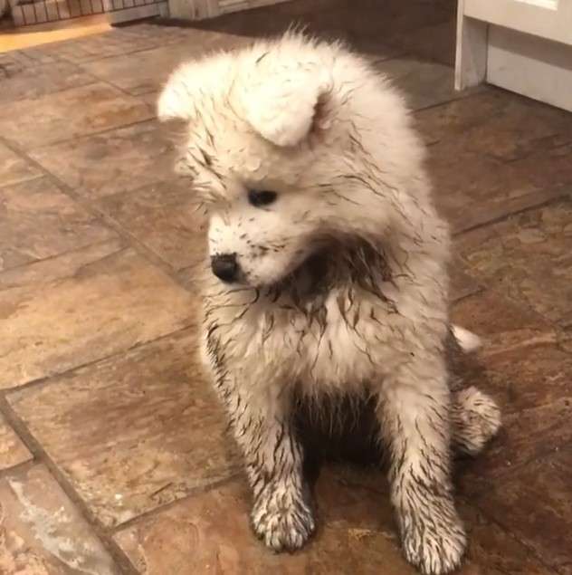 小薩摩耶「玩泥巴髒兮兮」忙辯解 熊抱出賣同伴:主人~這隻也有玩!