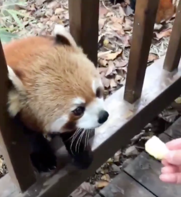 ▼網友拿著零食誘惑柵欄裡的小熊貓,牠大眼緊盯著零食,彷彿在說:「這是給我的嗎?」