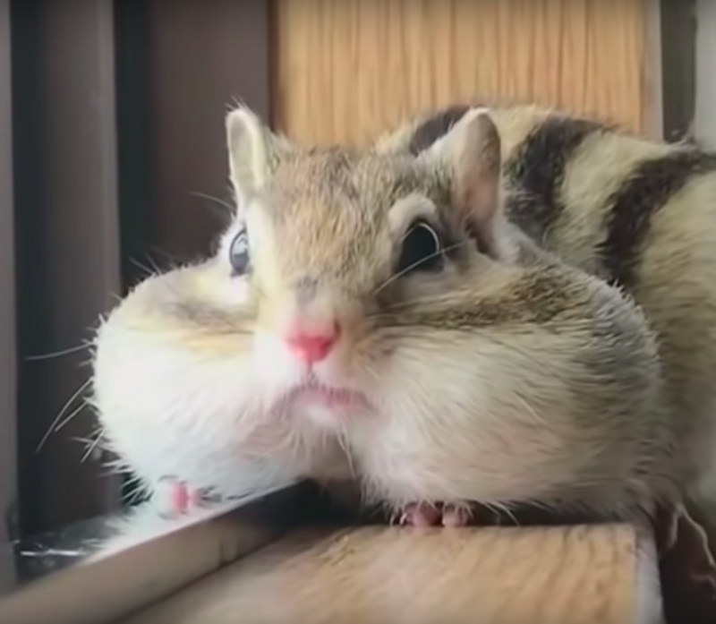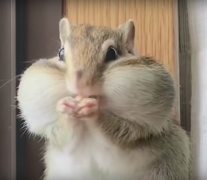 ▼這隻叫Bibi的花栗鼠頰囊裡塞了太多食物,看起來超卡哇伊。大概因為吃太多,牠忍不住開始打嗝,不停發出「咕啾咕啾」的聲音,肥嘟嘟的身體還隨之抖動。