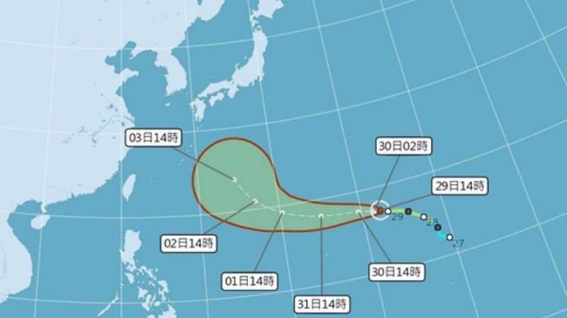 ▼目前「燕子」還在持續升級「發胖」當中,氣象局預警將有機會升級成強颱。