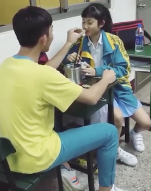 ▼教室裡最不起眼的角落正散發著「愛情的味道」,一對幸福的情侶正在甜蜜的餵食。