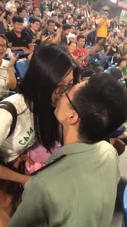 ▼之後兩人在Lamigo桃猿球迷的見證下,親密接吻了3秒讓全場都high翻了!