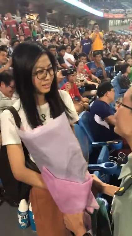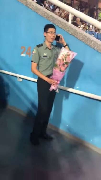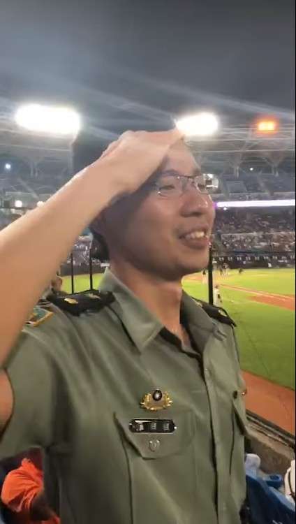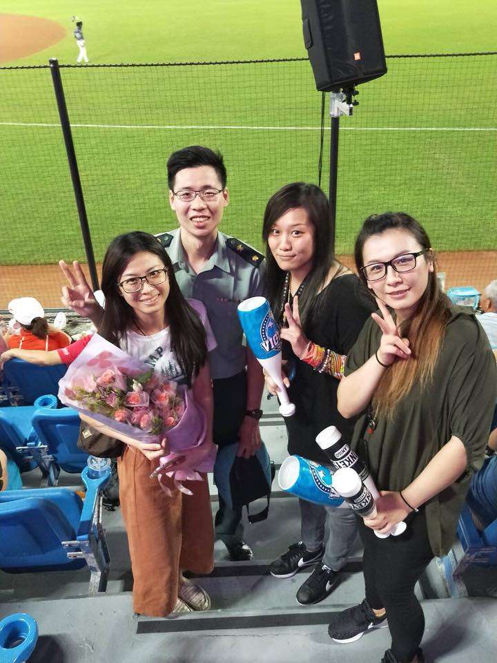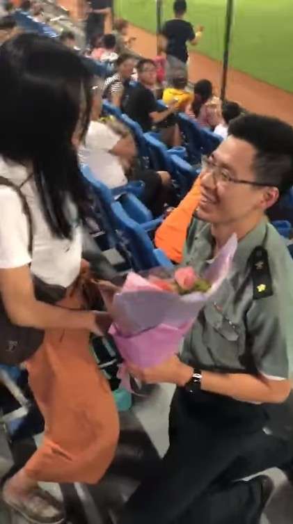 ▼9月2日當天,有網友Tony在臉書《爆廢公社》po文表示,他在球場看球賽時發現有一名軍人拿著花束在觀眾席後方不斷徘徊,於是他好奇的上前詢問,才知道這位名叫羅椲程的陸軍少校是來求婚的。當網友得知他沒有親友團幫忙後,就自告奮勇的充當他的攝影師,為他拍下這段感人的一刻。