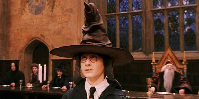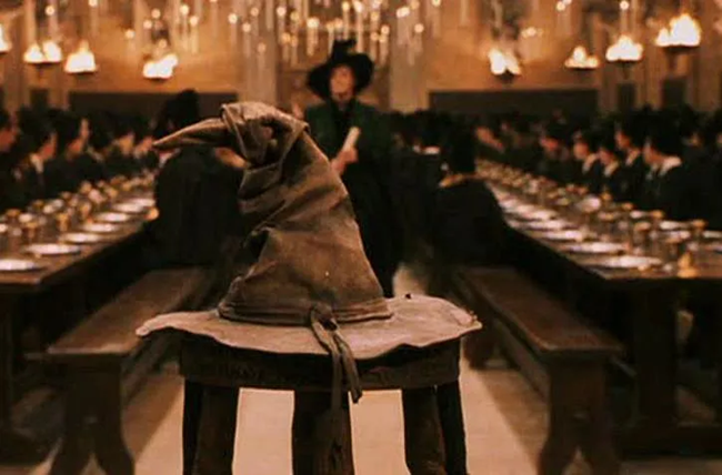 ▼在《哈利波特》中,分類帽是一頂有思想的帽子,每年霍格華茲的新生都會排好隊,等待著分類帽戴在他們頭上,分類帽會跟他們耳語,並且識破他們內心的想法,最後做出選擇,將他們分到葛萊分多、赫夫帕夫、雷文克勞和史萊哲林這四個學院其中的一個。