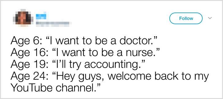 ▼歡迎來到真實的世界:「6歲時:我想當醫生」、「16歲時:我想當護士」、「19歲時;我會嘗試做會計」、「24歲時:嗨朋友們,歡迎來到我的Youtube頻道」。