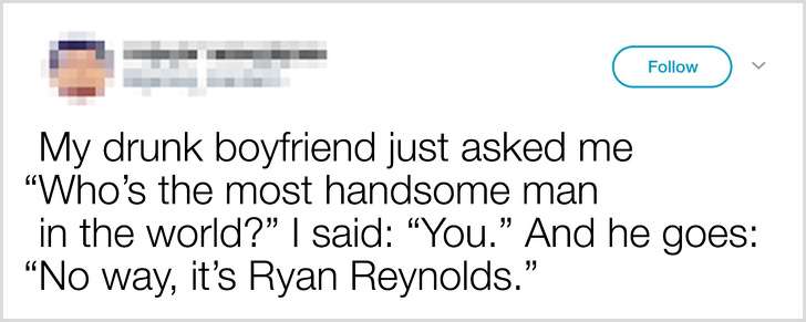 ▼喝醉的男朋友問我「誰是世界上最帥的人」,我回答「你」,他回說「不對,是萊恩雷諾斯(Ryan Reynolds)」。