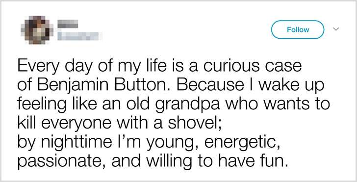 ▼「我的每一天都像是班傑明的奇幻旅程。每天早上醒來,我會變成一個想用鏟子幹掉所有人的暴躁老太太,晚上卻變得年輕,充滿活力、積極、樂觀。」