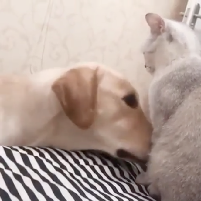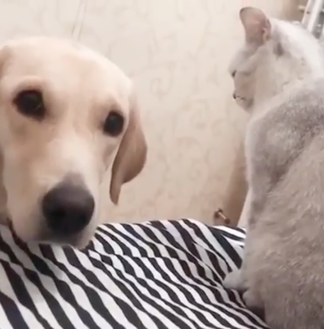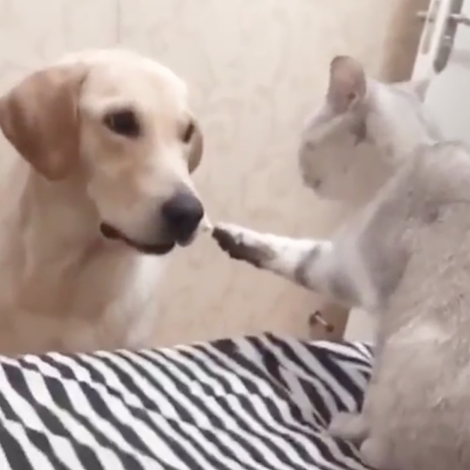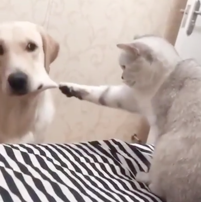 貓狗之間永遠不可能有和平這件事!國外一隻呆萌的狗就徹底體會到了這種感覺,牠明明只是想跟貓皇一起坐在床上,沒想到才不小心碰到貓皇一點而已,就慘遭「貓爪伺候」。超沒面子的牠也氣到站起來,差點要跟貓皇開打了~