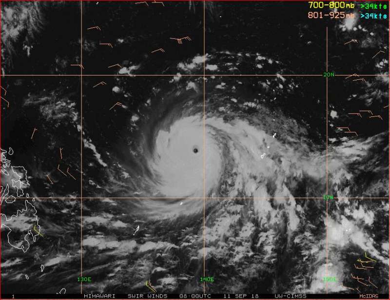▼山竹於11日上午8時增強為強烈颱風。資料顯示,截至11日晚8時,山竹中心附近最高風速為每小時220公里,預料周五接近呂宋海峽時,最高風速可達每小時250公里。 天氣風險管理公司總經理彭啟明說,該颱風最強巔峰時期可能是13、14、15日,成為今年太平洋最強颱風的機會相當高。