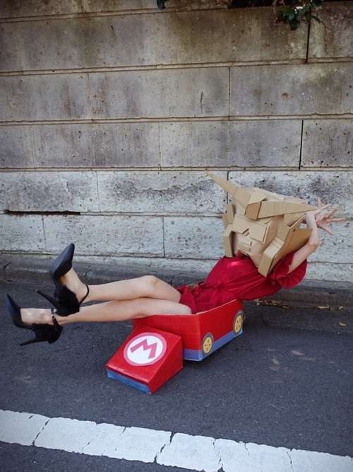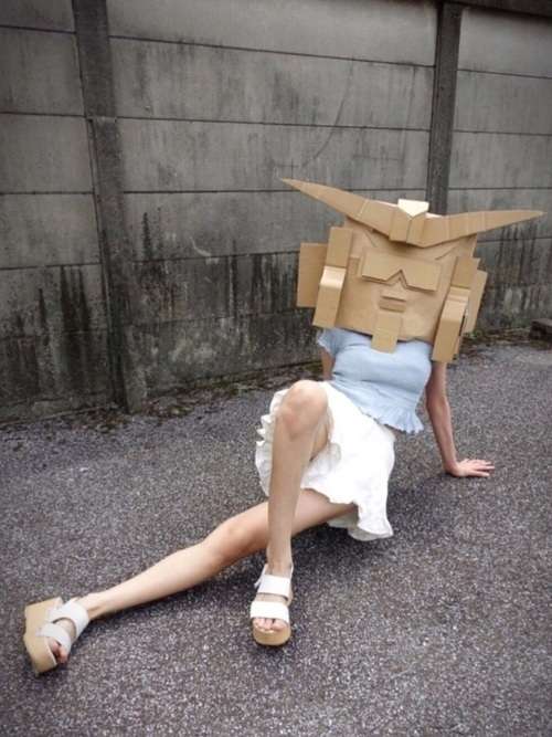 ▼紅裙高跟鞋性感迷人,但是坐在紙箱中又帶著頭盔,風格太碰撞了。