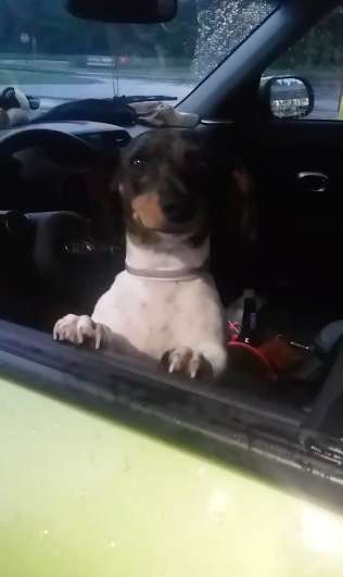 ▼一等前主人駛離,Fricker可以感受到懷中的小臘腸犬開始變得焦慮並發抖,即使Fricker當時並不打算讓家裡的汪汪家族多一名新成員,但還是好好安撫這隻小臘腸犬,由於小臘腸犬拒絕被鍊著,Fricker只好把她帶到車上放在自己腿上 ,看到小臘腸犬在腿上可憐巴巴的可愛模樣,Fricker決定要好好照顧小臘腸犬直到替她找到一個更好的家。