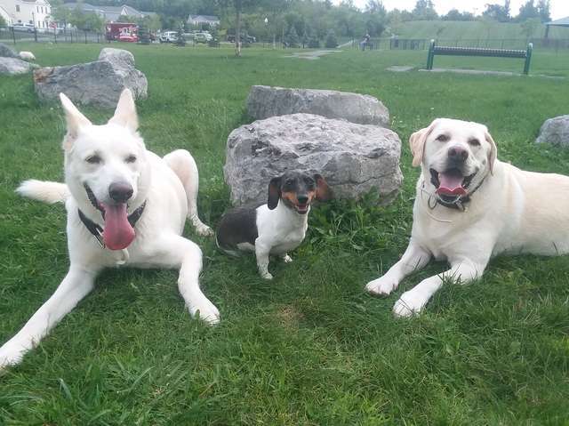 ▼Fricker家裡原先就有兩隻汪星人,莫莉遇上的第一個挑戰便是如何和家中兩位大汪汪兄弟Moo和Maddie相處,一開始莫莉對這兩隻白色巨犬有點害怕,但很快的,體型有極大差距的三兄弟(妹)就打成一片像家人一樣。