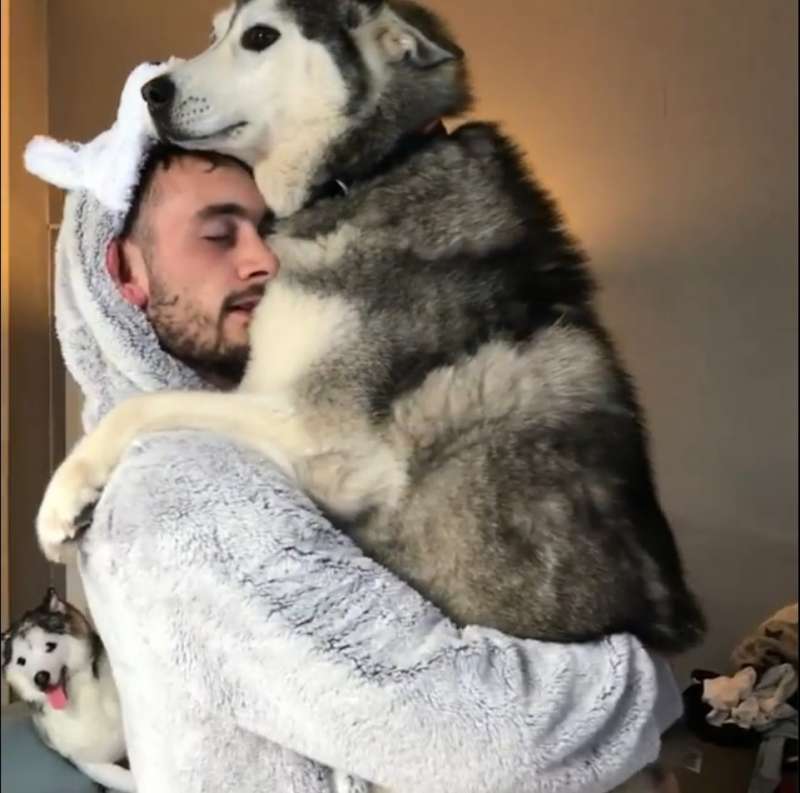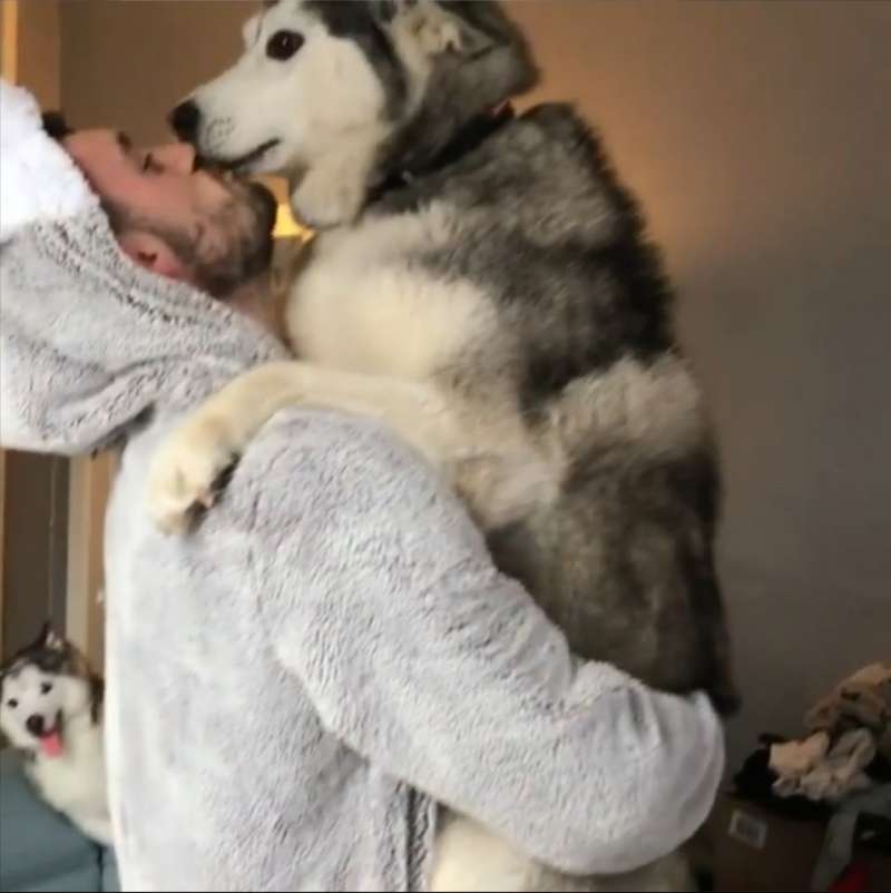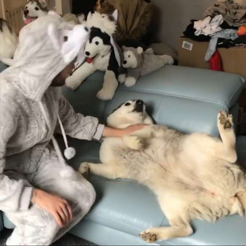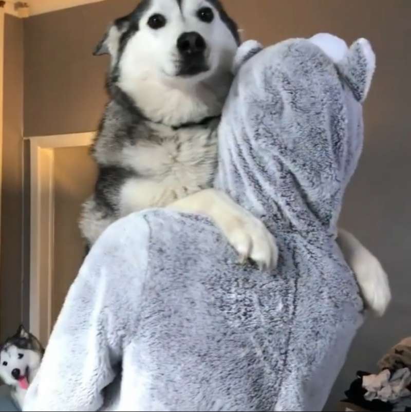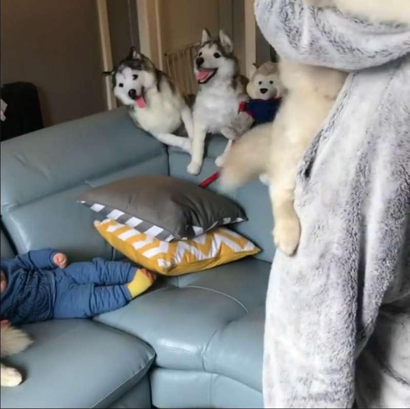這天,家裡的把拔穿上哈士奇玩偶裝,和月月玩起巨嬰抱抱,一人一月浪漫的轉著圈圈,月月的兩隻肉掌緊緊抱著把拔曬恩愛,對旁人視若無睹,一開始寶寶躺在一旁沙發上默默的凝視這一切,對這樣的情景似乎習以為常。