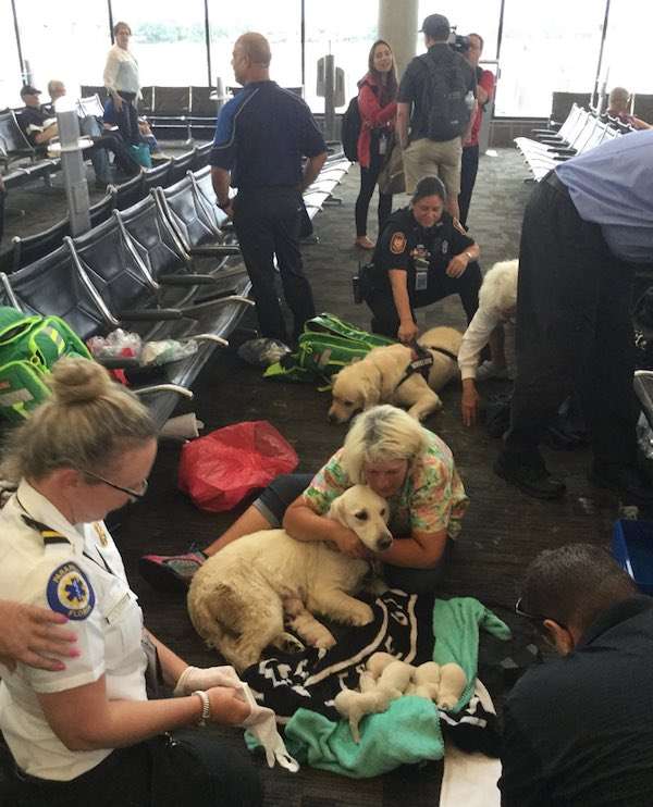 ▼機場工作人員連忙過來幫忙,並通報消防人員。機場的消防人員和一名要搭飛機的護士幫Ellie接生,後來那名熱心的護士必須離開去搭飛機,兩名機場醫護人員馬上接手。在大家的幫助下,Ellie順利生下了8隻可愛的狗寶寶。
