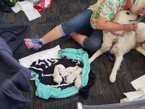 ▼Diane帶著兩隻狗狗來到佛州坦帕國際機場(Tampa International Airport),準備登機時,2歲狗狗Ellie的子宮突然開始收縮,並開始生產。Diane手足無措,她知道Ellie懷孕了,但沒想到這麼快就要生寶寶。