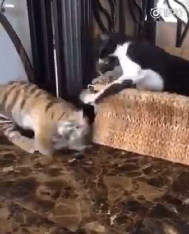 ▼來看看這隻貓咪是如何霸氣的欺負小老虎吧: