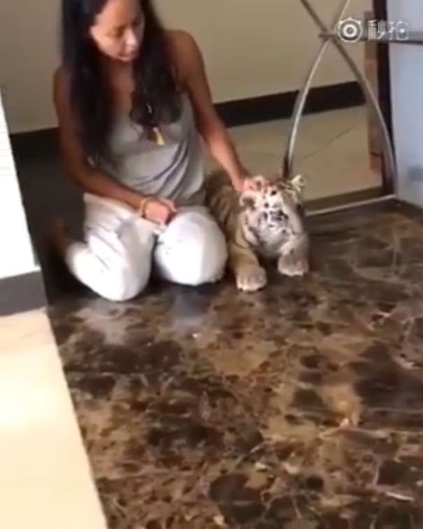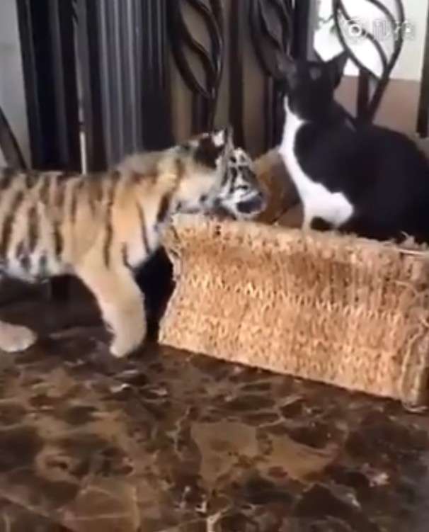 ▼鏡頭一轉,這位「新成員」竟然是一隻出生沒多久的小老虎!