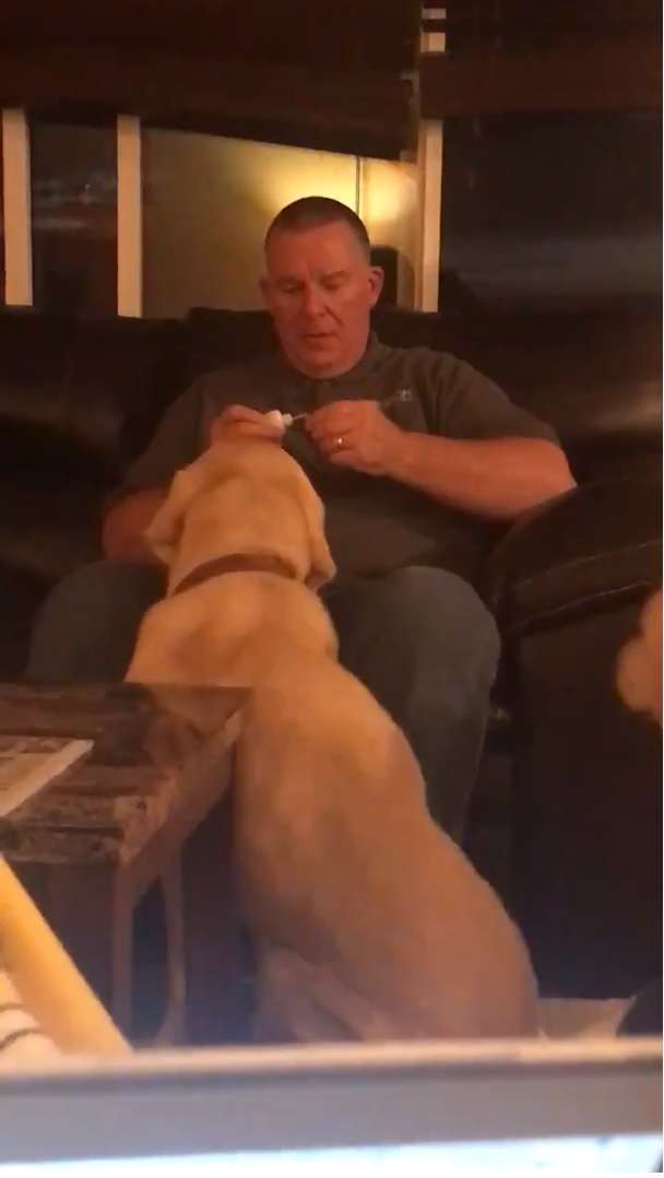 ▼影片中的兩隻黃金拉布拉多,正在乖乖讓爸爸滴藥的是姊姊,而在一旁安靜坐著等待的,就是我們今天的主人翁 -「凱許Cache」。姊姊因為醫療上的需求,必須在耳朵點藥進行除蟲,但凱許不用,也不知道他在那邊瞎湊個什麼熱鬧,還排隊咧!