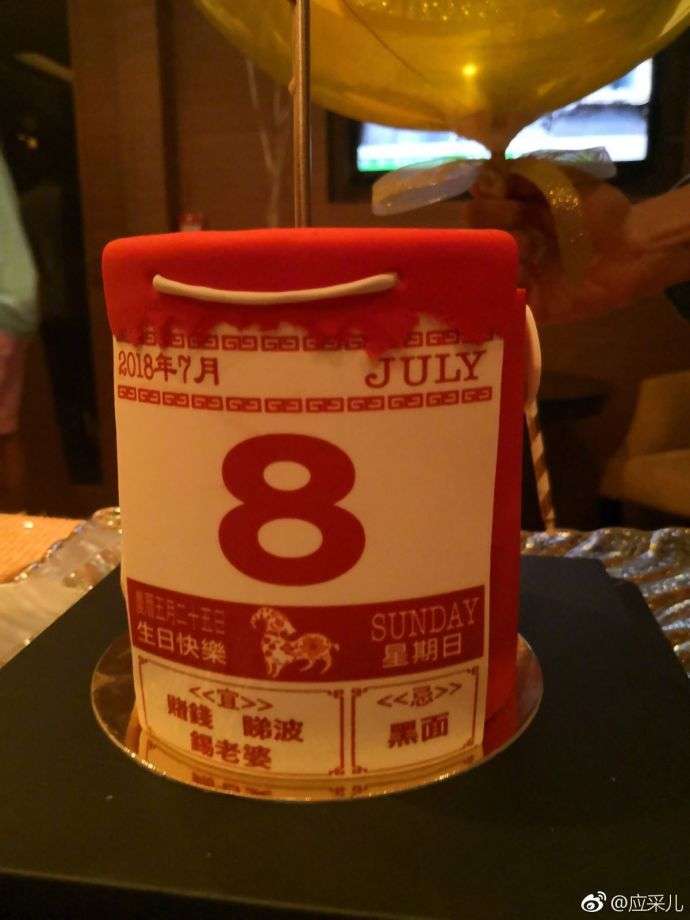 ▼最後是陳小春在7月8日51歲的生日會上,應采兒不僅為老公準備了蛋糕慶生,根據她在微博上秀出的照片,還可以看到下方日曆造型的蛋糕上,除了寫著陳小春的生日日期之外,還寫著「宜:賭錢、看球、疼老婆;忌:黑面」,實在非常搞笑又有創意!