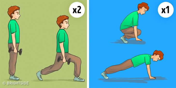 從直立變成弓箭步的姿勢,確保膝蓋不要超過腳指頭,接著跳起來切換前後腳,做完兩次後進入立臥撐跳。