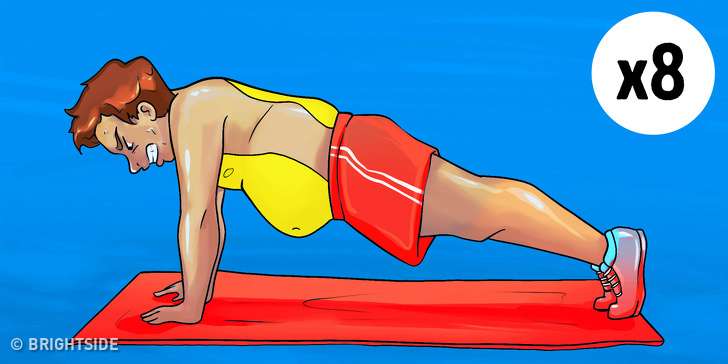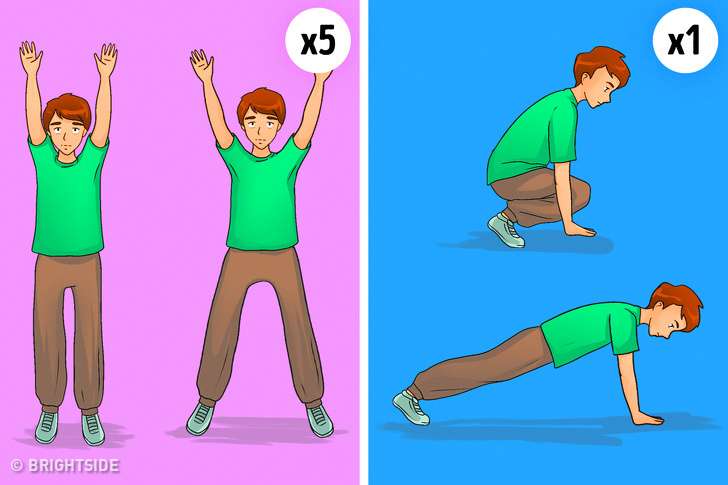 這兩個動作相信大家都不會太陌生吧!進行了5下開合跳後,蹲下將手掌平放到地面,雙腿向後移進入俯臥撐的姿勢,接著收回雙腿向上跳。連續做8次之後,休息一分鐘換動作。