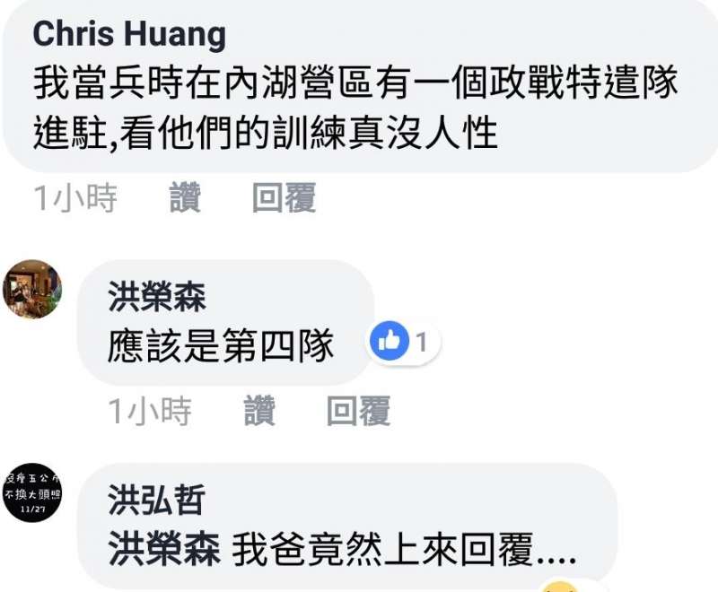 政戰特遣隊退伍弟兄協會分享了洪弘哲的文章,爸爸也加入一些相關臉書社團,希望能找到人。網友們看到爸爸年輕時帥氣的照片,紛紛表示:「我視線一直離不開肌肉」、「好帥喔」、「當三年兵的都是真男人」、「以前的軍人真的眼神透露殺氣」。希望洪先生早日找到同梯啊~