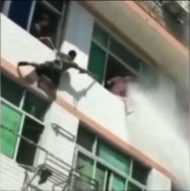 ▼女子將門反鎖,大半身體探出窗外。警消人員怕她有危險,就從隔壁窗戶伸出一根「鋼叉」,想把她推回房間內。但女子脾氣倔強,還說:「你們不用勸我!」