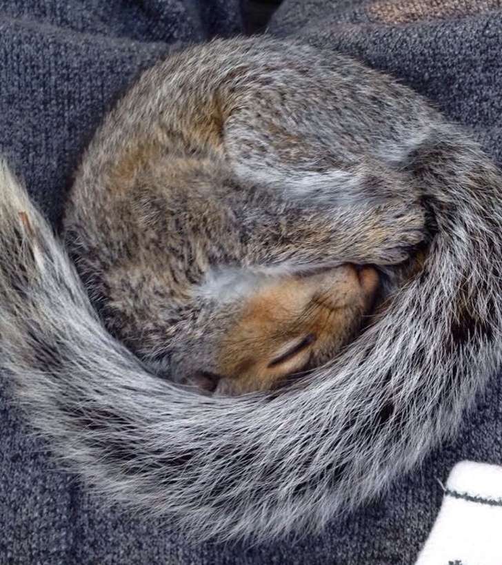 ▼小松鼠把自己捲進了長長的尾巴裡,瞧牠睡得多有安全感。
