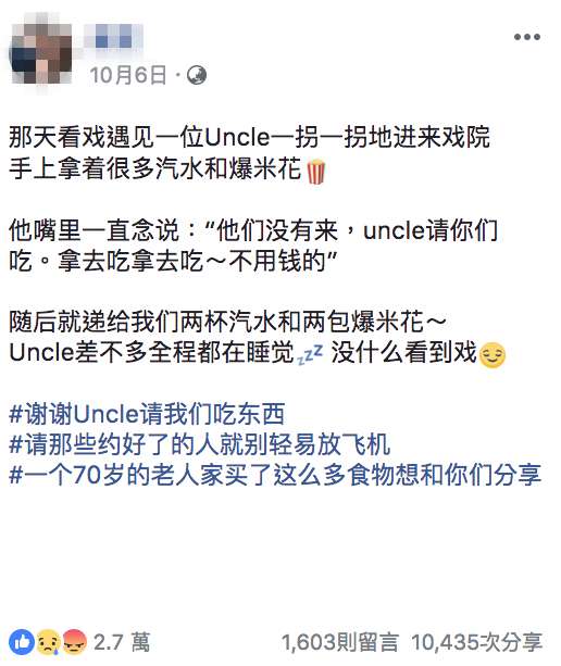2018年10月11日阿公心碎了⋯馬來西亞一名女網友分享在電影院遇到一位70多歲的老爺爺,他一個人買好了好多爆米花和汽水,結果卻等不到約好的人來一起看電影。女網友猜測他當時可能是在等孫子來看電影,只是一直都等不到人出現⋯