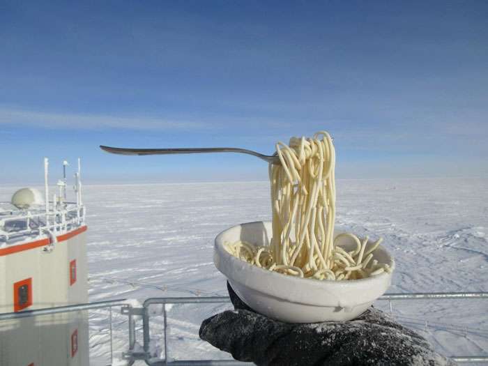 ▼他與同事們跑到室外烹飪,烹調各種各樣的食物。這可不是普通的野餐,還展現了南極的絕對嚴寒。