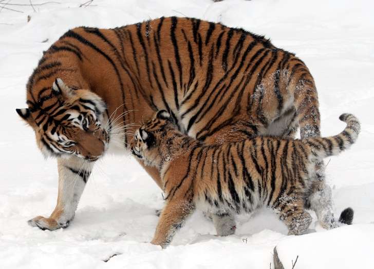 ▼虎媽正在教導牠的兒子,如何在雪地裡獵食與生存。