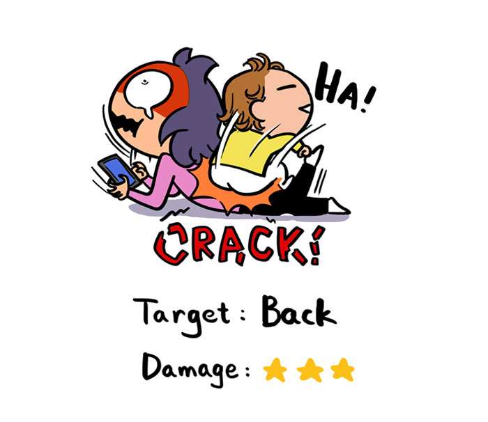▼攻擊目標:背部。『傷害程度』- 三顆星。 「玩手機不理我的下場就是這樣,怕了吧?」