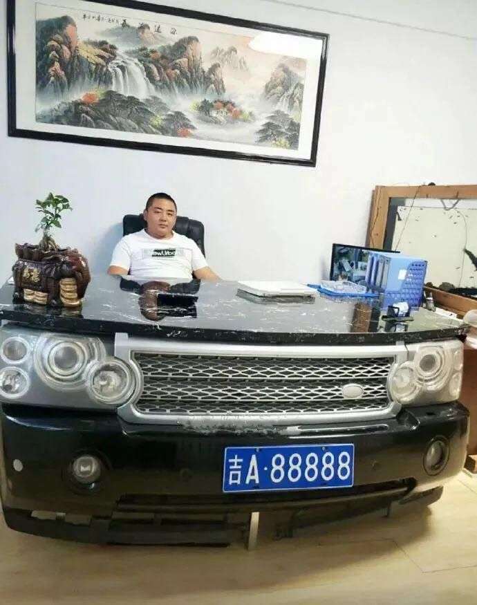 ▼其實這不是第一次有人將車頭與辦公桌做結合,中國大陸有網友曾經貼出照片,表示「男人,就要對自己狠一點」,只見畫面中巨大車頭上方是平滑的大理石桌,車頭前方車牌掛著「88888」,辦公後方還搭配大幅山水畫,整體風格華麗而且相當霸氣,引起網友熱議。
