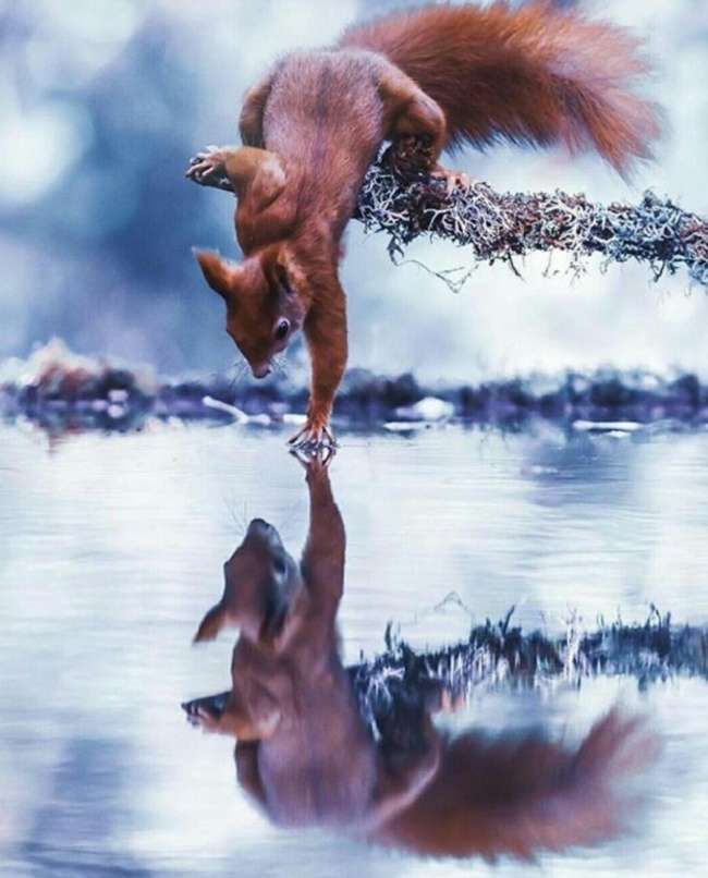▼13.一隻松鼠觸摸像明鏡般水面的瞬間。