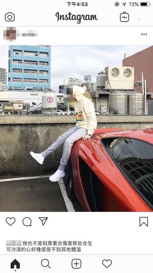 ▼根據原po所分享的照片,有網友找出了這名男孩的IG,只見他掰了一個帥氣的姿勢,還在下方寫道「我也不是刻意要去傷害那些女生,可冷漠的心好像感受不到其他體溫」。