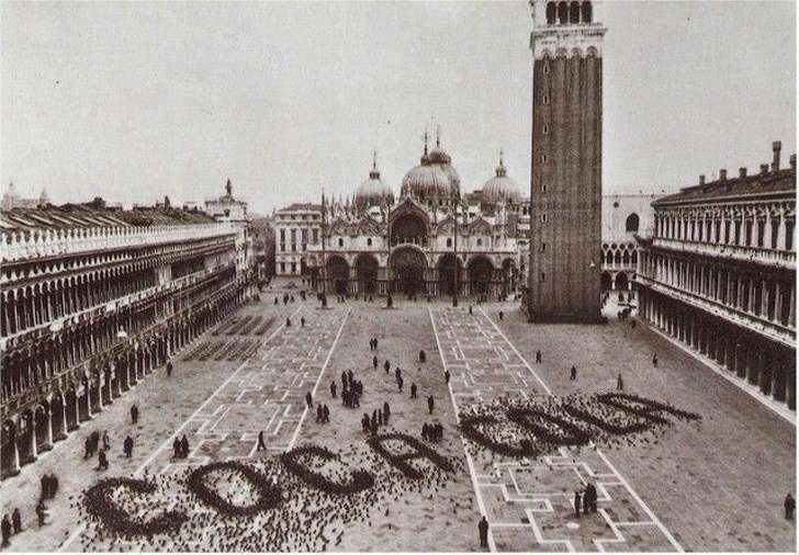 ▼1960年代,可口可樂公司在威尼斯的廣場吸引鴿子,組成商標做廣告。