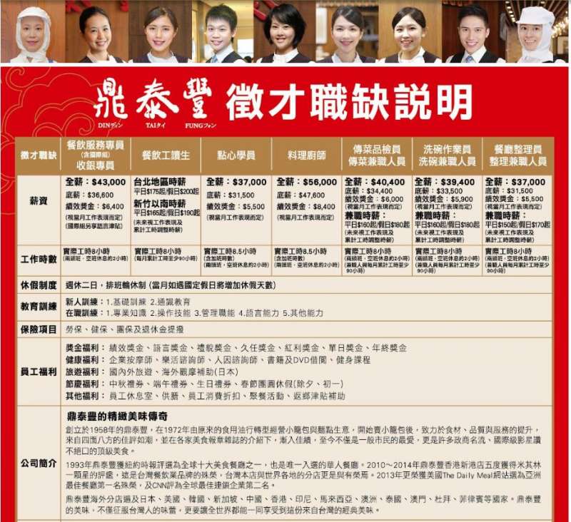▼鼎泰豐除了三節獎金以外,還提供國內外旅遊、日本觀摩見習、語言學習津貼、企業按摩師等福利。公司設立「小老師」制度,指導新進員工服務技巧。經本次徵才獲得錄取,錄取資格可保留至年後上班。