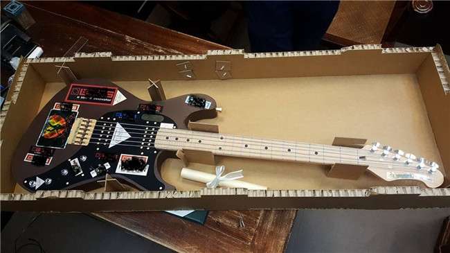 ▼還有親友為已故的樂師訂製吉他,款式和上面的貼紙都跟實物一模一樣,區仲謙說:「最初家人想燒個真的吉他,但太名貴了,但是又想讓老人家有最鐘愛的樂器陪葬,其他紙扎鋪都很難做到。」