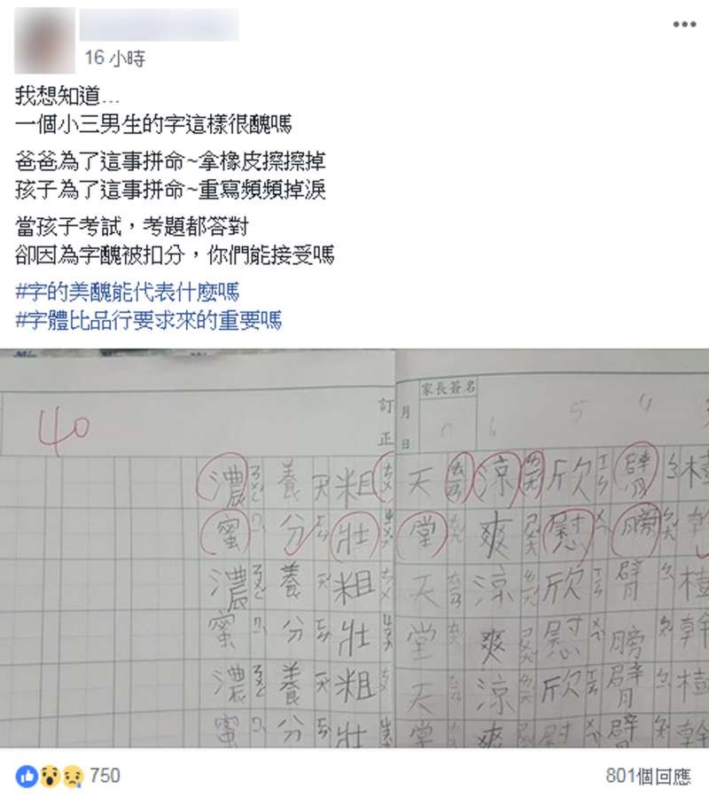 ▼一位母親在臉書《爆廢公社》發文,表示自己就讀小三的兒子因為作業的字寫得太醜,竟然被老師扣分還要求訂正,讓小孩在重寫時「頻頻掉淚」,懷疑老師過分嚴格。