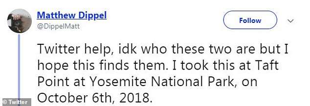 ▼Matthew將照片po到推特上,並說:「求助!我不知道這兩個人是誰,希望網友們幫我找到他們。2018年10月16日,我在優勝美地國家公園的塔夫特角拍到了這張照片。」