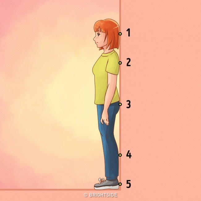 ▼站在牆邊,肩胛骨、臀部、小腿碰到牆壁。收腹後深呼吸幾次。