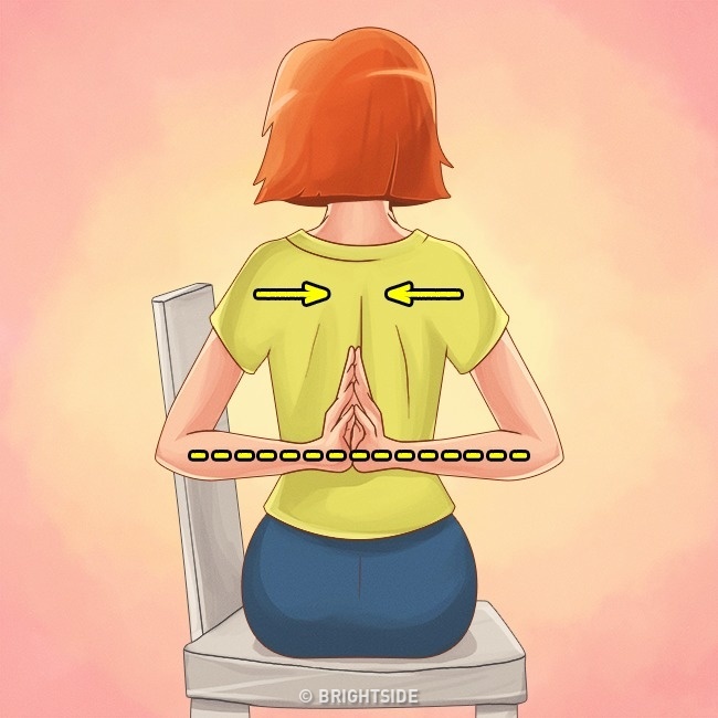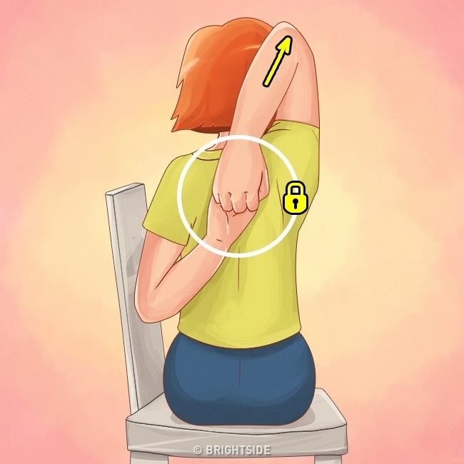 ▼將一隻手臂放在背後,另一隻手臂抬起,繞過肩膀抓住身後的手,保持這一姿勢5秒鐘,然後兩隻手交換位置。