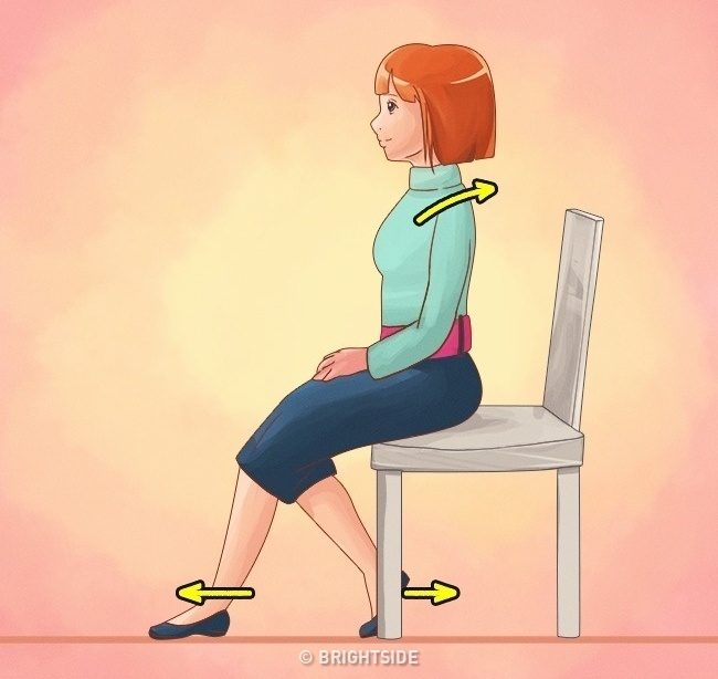 ▼坐在椅子邊緣,一條腿後撤,放到椅子下面,另一條腿前伸。這樣的坐姿可以讓你不自覺挺直脊背。