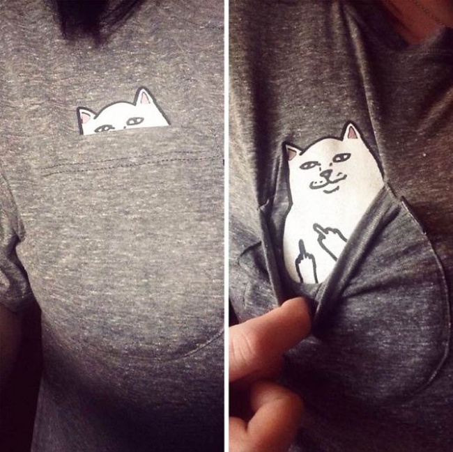 ▼貓咪T恤:這是紐約設計師Jayme Lemperle為知名運動服裝品牌「Ripndip」設計的T恤。款式很普通,但口袋裡卻藏著一隻豎中指的貓咪。
