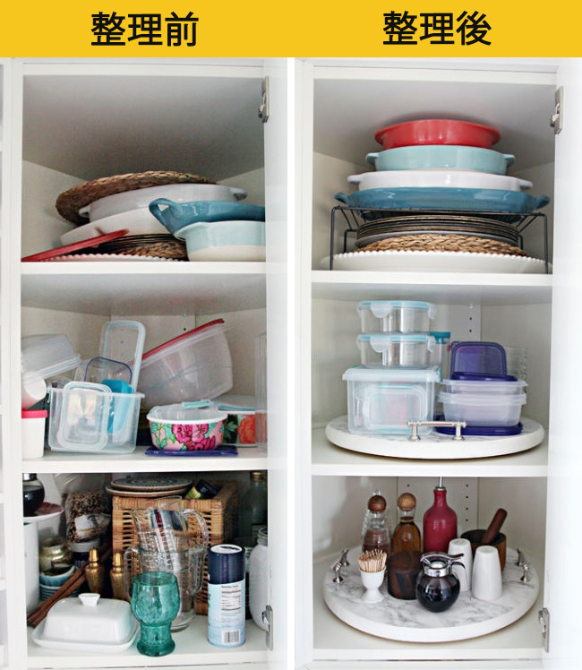 ▼10. 扁扁的會東倒西歪的廚具,將收納格變成左右的方式收納,就可以收納更多的物品了。