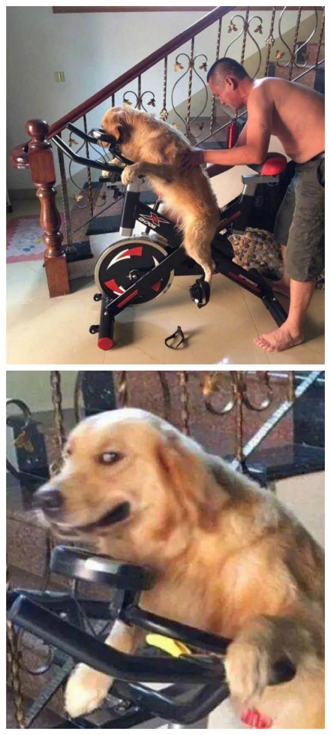 ▼我爸一喝醉,就要教狗狗騎腳踏車