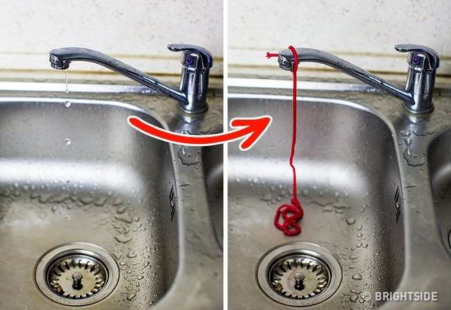 ▼水龍頭一直「滴答滴答」滴水的話,就在出水口綁上一條線,水順著線流下來,就不會發出噪音了。