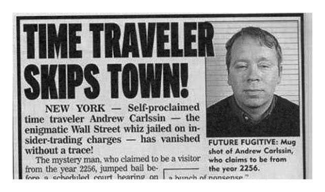 2003年,聯邦調查局逮捕了一名男子安德魯·卡爾森(Andrew Carlssin),他被指控進行證券交易詐騙。最初他只有800美元,然後通過126筆風險交易賺了3.5億美元。在被捕後,安德魯說他收到了來自未來的訊息,根據他的說法,他是一個時間機器上的2256年出生的。後來有人為他支付了100萬美元的保釋金,隨後安德魯就消失了。