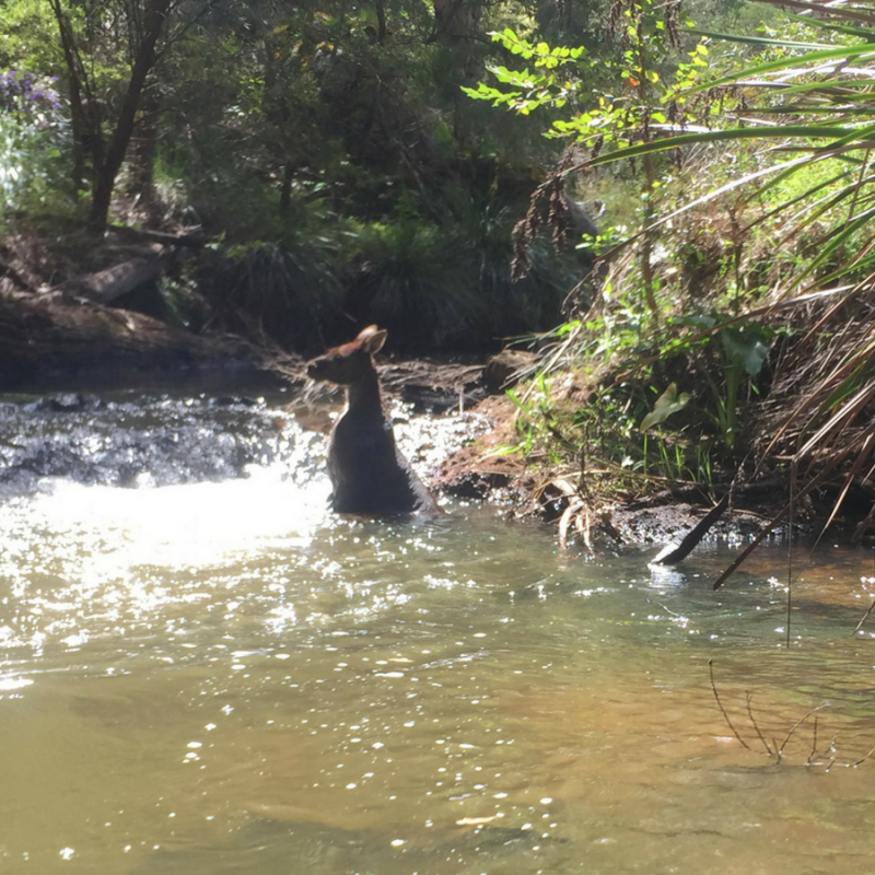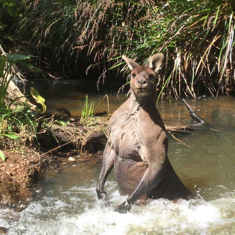 2018年10月22日大家在河流或小溪中看過最不同凡響的事物是什麼?澳洲一位男子就在老家後方的小溪當中看到一個巨大的身影,仔細一看竟然是隻超巨大的袋鼠正在洗澡!