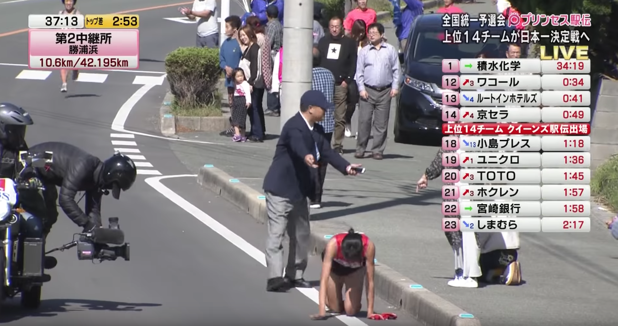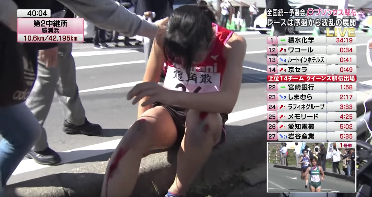 2018年10月24日比賽開始了就不能放棄!日本19歲路跑選手飯田怜參加福岡一場女子路跑接力賽,但是比賽中途卻跟後方選手發生腿部碰撞,當場就倒地不起,然而她卻為了比賽,不顧身體已經痛到無法站立,直接跪在滾燙的柏油路繼續前進!
